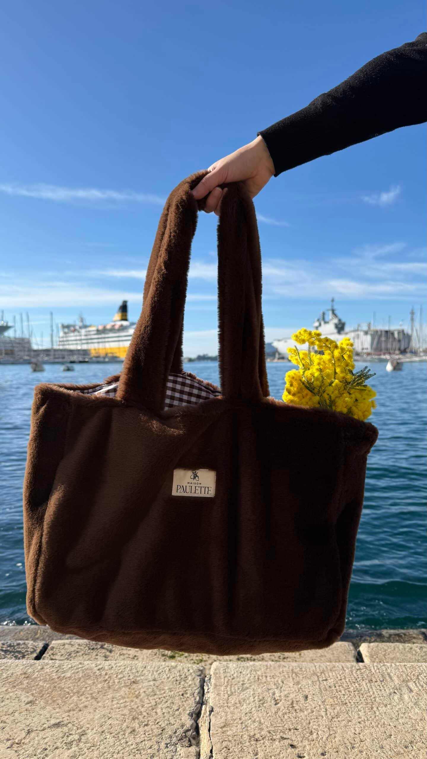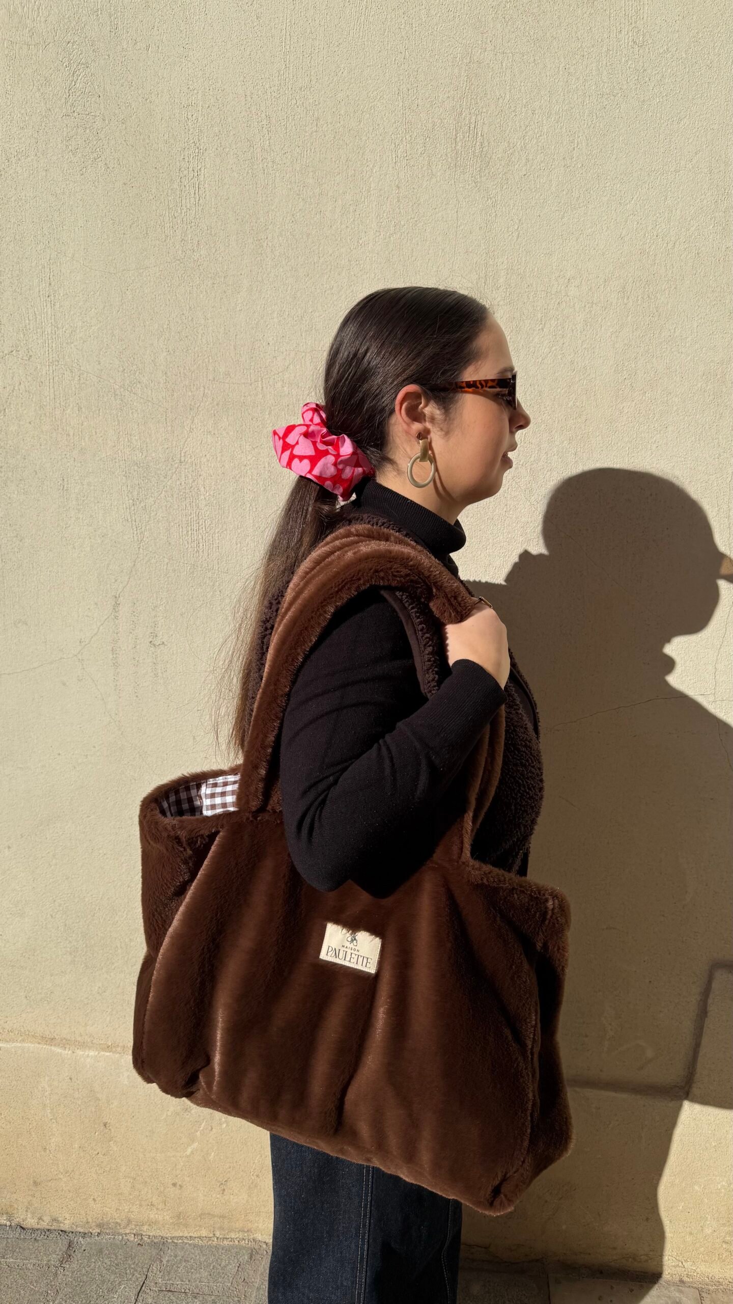 Grand sac cabas en fausse fourrure marron chocolat, doux, spacieux et fait main, avec intérieur vichy en coton.
