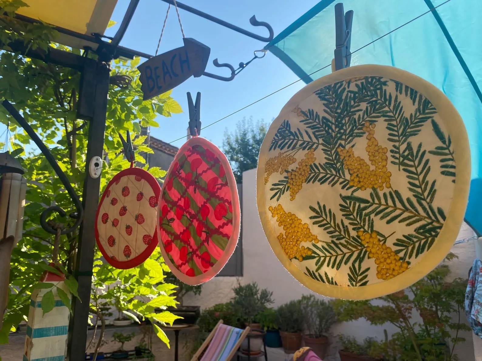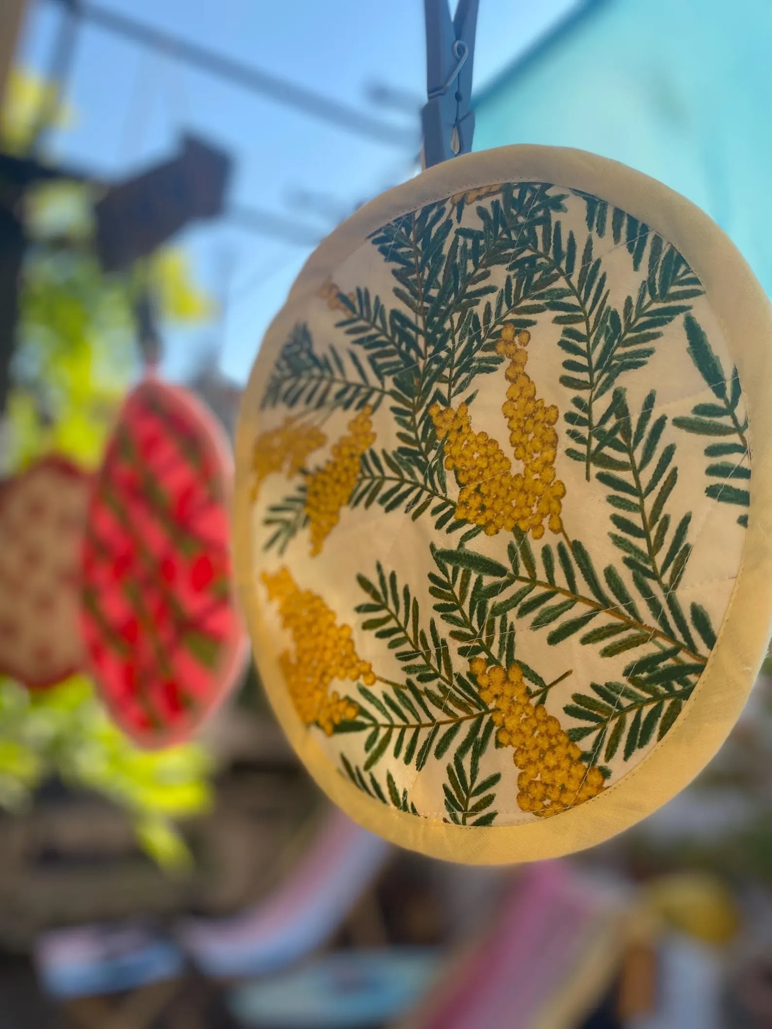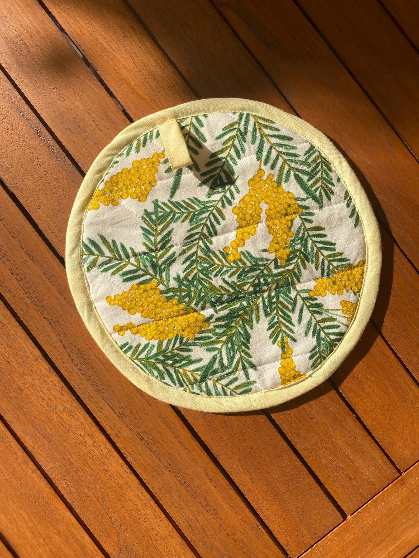 Manique ronde en coton motif mimosa, cousue à la main dans le Sud de la France. Un accessoire lumineux et pratique pour protéger les mains en cuisine.