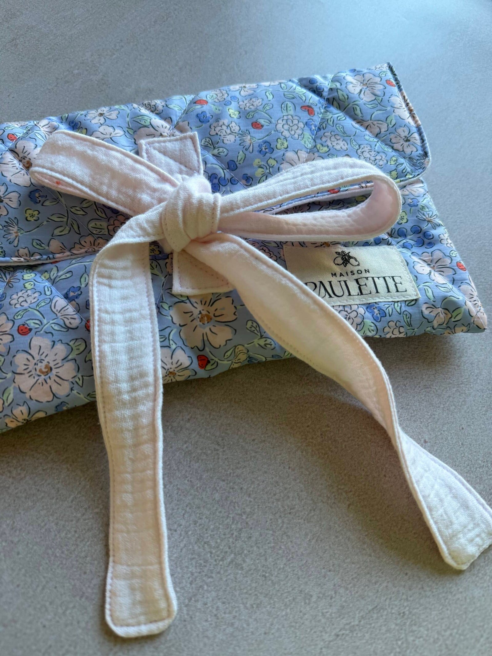 Le matelassage moelleux protège efficacement vos romans et livres de poche dans un sac ou une valise, tandis que la fermeture par lien à nouer en coton apporte une touche simple et poétique. Chaque pochette est confectionnée à la main, en petite série, dans l’univers doux et solaire de Maison Paulette.