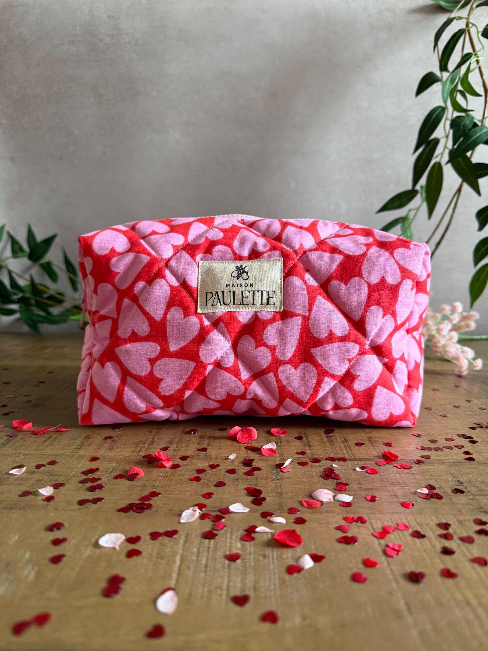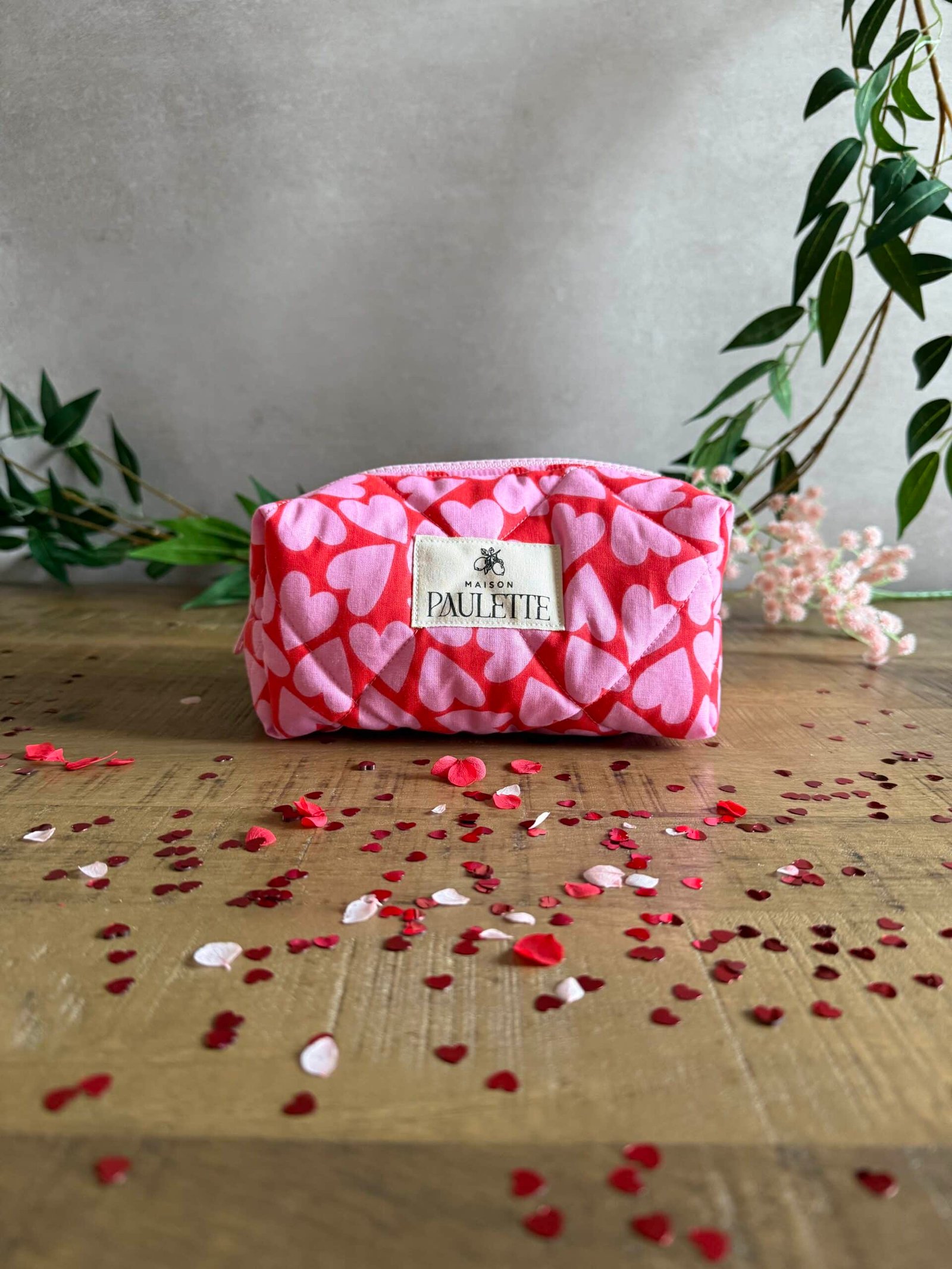 Un rose tendre, des cœurs délicats et un matelassage tout doux : la trousse idéale pour une attention pleine de poésie au quotidien.